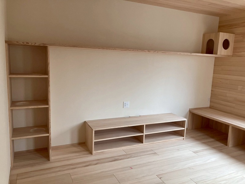 左側の一見収納棚に見える棚も、よく見るとねこちゃんが通れるように穴が空いています!