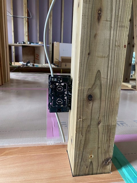 建物の外周面に関しては断熱材としてセルロースファイバーを壁内に充填しますので、壁のセルロースを吹き込んだ後のコンセントやスイッチの移動は難しい為に現場にてコンセントやスイッチの位置の最終確認をお願いしています。