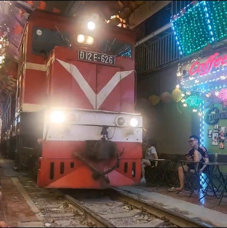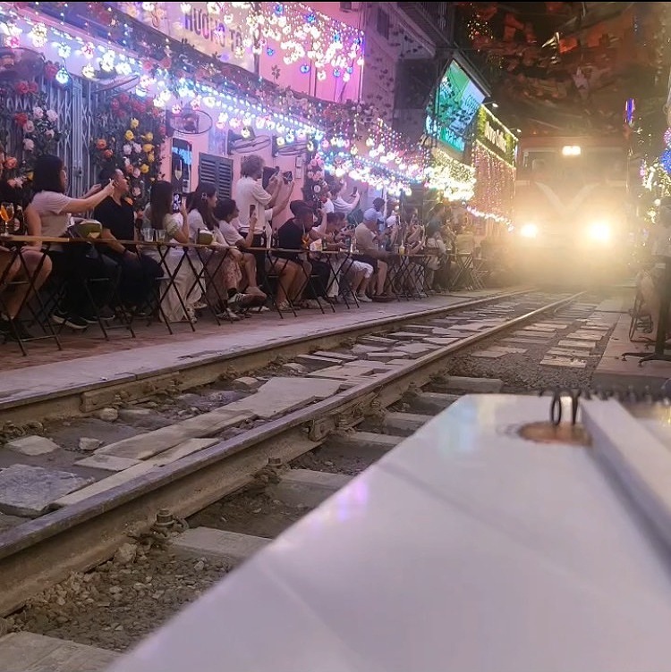 ご飯を食べた後、道に線路が走っている町で、間近で電車が通り過ぎるのを、
