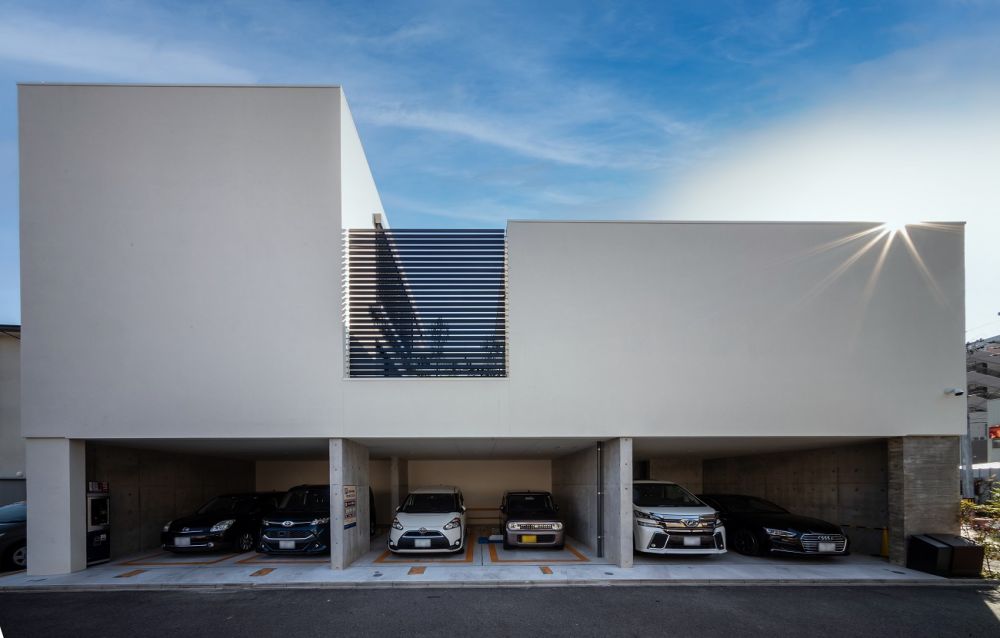 大きな壁で外からの目隠しをしつつ、2階にあるリビングに光を取り込むように工夫されたこちらのお家。