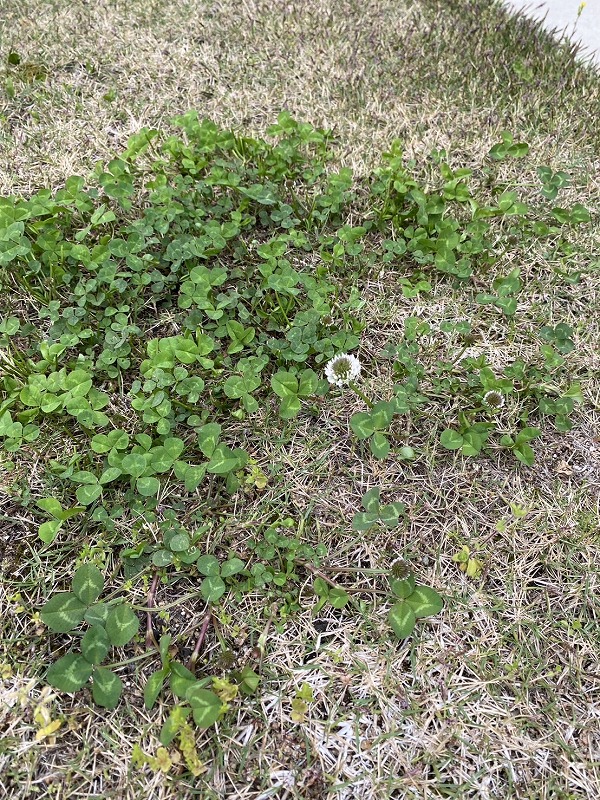 色とりどりの花が咲きそろう中、モデルハウスの芝にはクローバーや雑草がたくさん育っていました☘