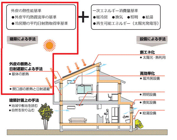 住宅の省エネ基準は、「外皮性能基準」と「一次エネルギー消費量」の2つの性能基準を規定していますが、