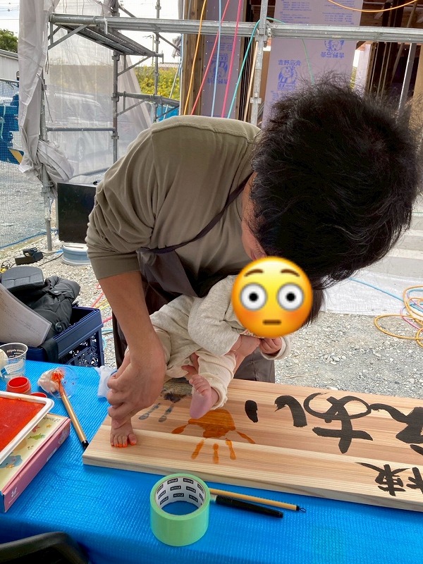 午前中にはお施主様御夫婦とお子様で手形式を執り行わせていただき、まだパーのできないお子様でしたので足型を板に押させてもらいました。
