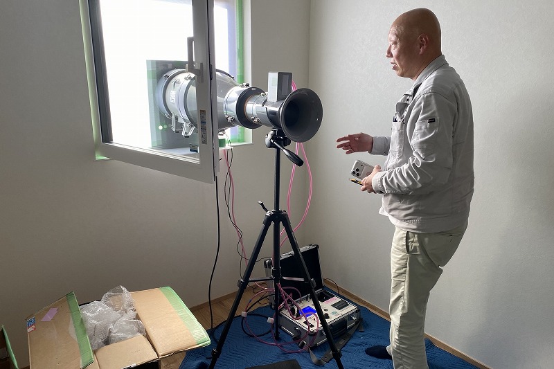 測定器を回しながら、大工さんと当社の有資格者(気密測定技能者)が一緒に現場をチェックします。 「ここから少し空気が漏れている」「もっとこうすれば数値が良くなる」と、リアルタイムで隙間を探して埋めていくことで、より良い数値(性能)を作り上げていくことこそが、1回目の真の目的です。