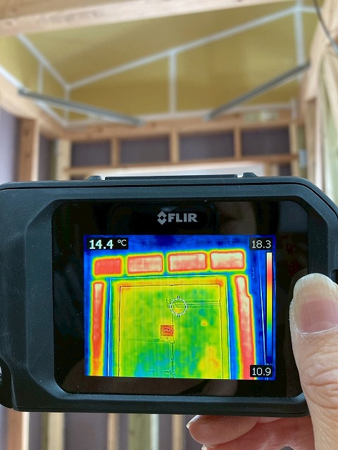 この写真のサーモカメラの画面の上部は(青い部分)屋根部分でこちらには断熱材が入っており、下の部分(赤い部分)は壁なのでまだ断熱材が入ってない状態の写真です。