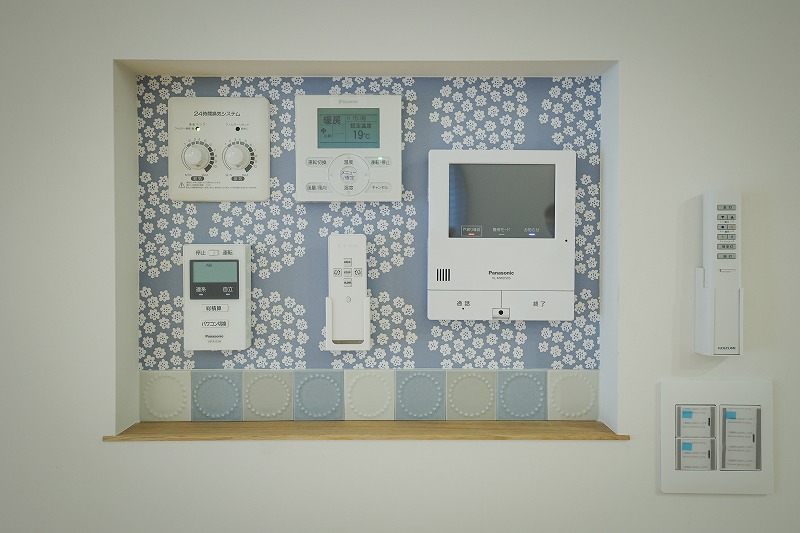 スイッチやリモコン類はどうしても生活感が出やすい場所ですが、このようにニッチの中にアクセントクロスを取り入れることで、インテリアの一部として楽しむことができます。