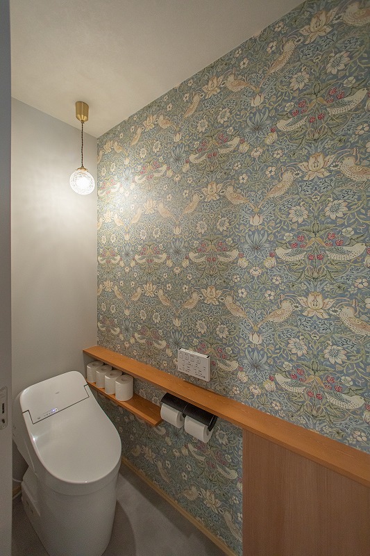 トイレはコンパクトな空間だからこそ、こうした柄物クロスを取り入れると一気に雰囲気が変わります。