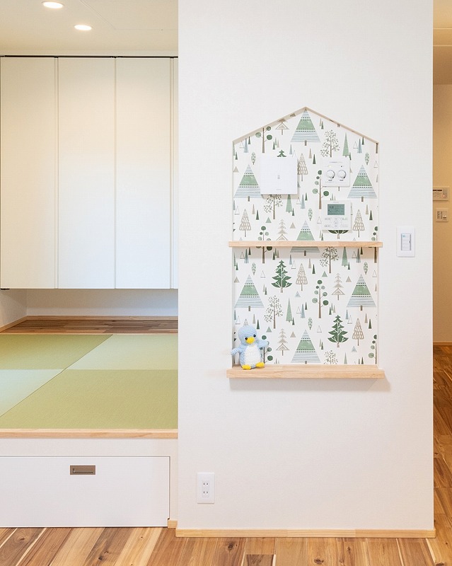こちらはリビング横のスイッチニッチに採用したアクセントクロスです。