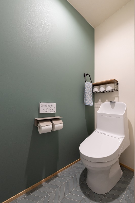 こちらはグリーンのアクセントクロスを取り入れたトイレです。