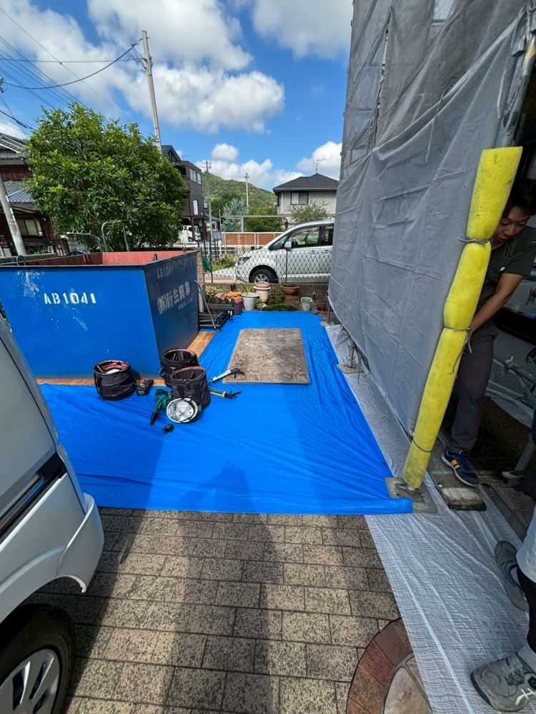 まずは足場を設置し、その後、既存の外壁と内部の防水シートを慎重に取り除く作業を進めています。