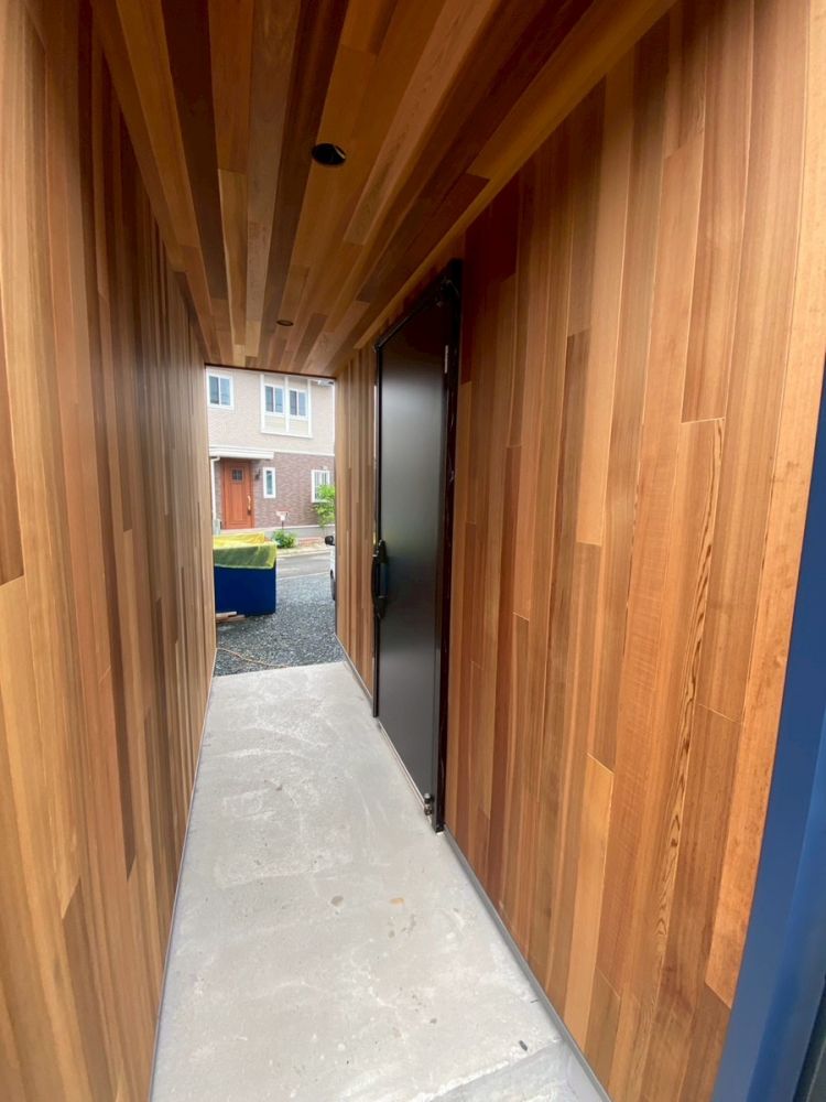 玄関まわりには、レッドシダーをふんだんに使った木のトンネルのようなアプローチを。