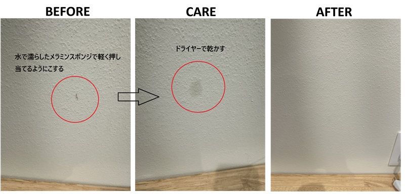 汚れが気になる場合は、濡らしたメラミンスポンジを軽く押し当ててこすり、その後ドライヤーで乾かせばOK。