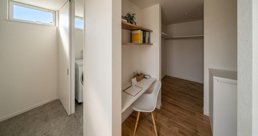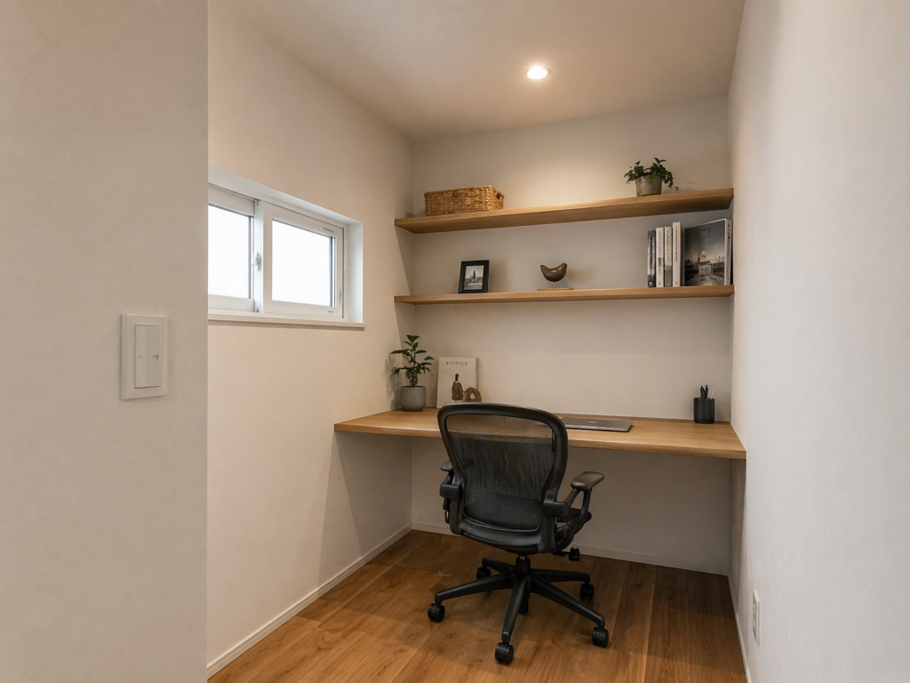 限られた広さを最大限に活かす空間活用と、集中力を高める落ち着いたしつらえ。 家族を想う時間と同じくらい、自分自身を大切にする。そんな大人のゆとりを感じていただける場所です。