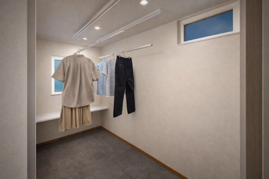 「共働きで忙しくても、天気を気にせず干したい」という想いから、バルコニーをなくし室内物干しを完備。高気密・高断熱と全館空調があるからこそ、室内干しでも驚くほどカラッと乾く、家事時短の極意をご覧いただけます。