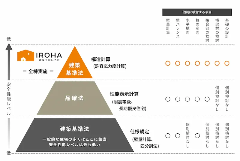 耐震計算には主に2つの方法があります。従来の壁量計算は、間取りの縦横で耐力壁の量をチェックするだけの簡易的な計算です。一方、建築工房いろはが採用する許容応力度計算は、地震や荷重に対して柱・梁一本一本が十分に耐えられるかを詳細に検討する、最も安全性の高い構造計算方法です。