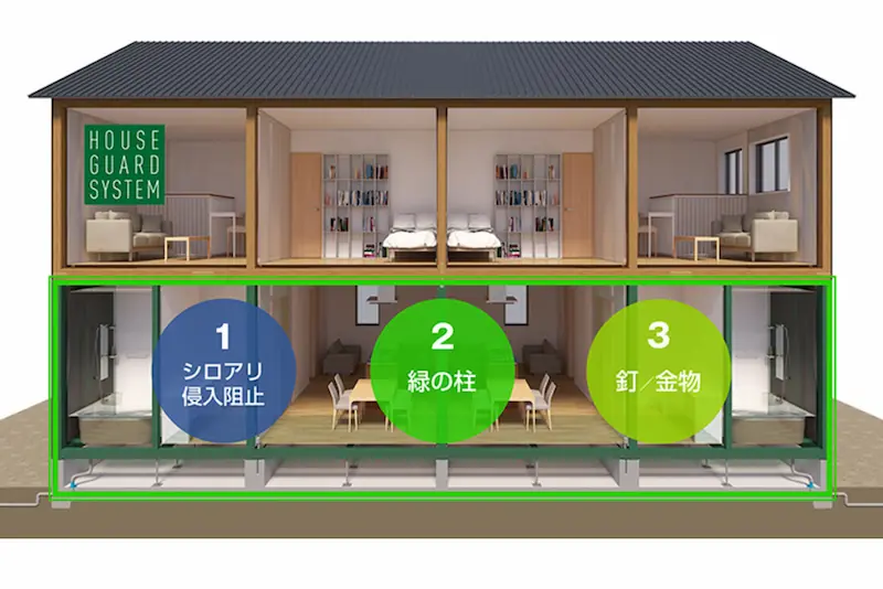 「腐らない木」として知られる緑の柱は、防腐・防蟻処理が木材の内部までしっかり浸透しており、高い耐久性と優れたメンテナンス性を持ちます。国の公共土木事業にも採用されている信頼の技術で、一般的な木材とは異なり、長く安心して快適に暮らせる住まいづくりを実現します。