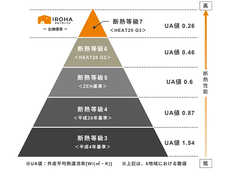 建物の断熱性能を数値で示す指標が「UA値」です。この数値が小さいほど断熱性能が優れていることを意味します。建築工房いろはでは、地域ごとに定められた基準を大きく上回る断熱性能を追求し、寒冷地である北海道と同等の住環境を実現しています。