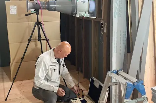 目には見えにくい気密性能だからこそ、いろはではお客様に安心していただけるよう、社内の有資格者が「工事中」と「完成後」の2回、気密測定を実施しています。測定結果は報告書にまとめてお渡しし、住まいの性能をしっかりとご確認いただけるようにしています。こうした丁寧な検査と社内ルールのもとで、心地よく、長く安心して暮らせる住まいをご提供しています。