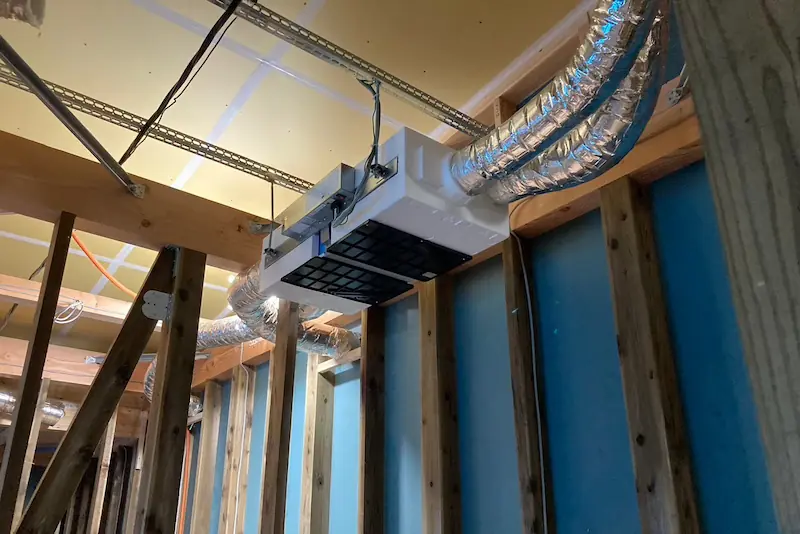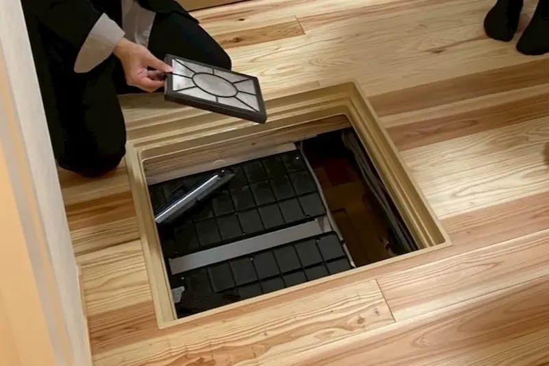 本体は上下反転して設置できる設計。2階の床面にフィルター面を向けることで、脚立を使わず手の届く位置でフィルター清掃や交換が行えます。高所作業の不安もなく、日常のメンテナンスをもっと安全に、もっと手軽に続けられます。