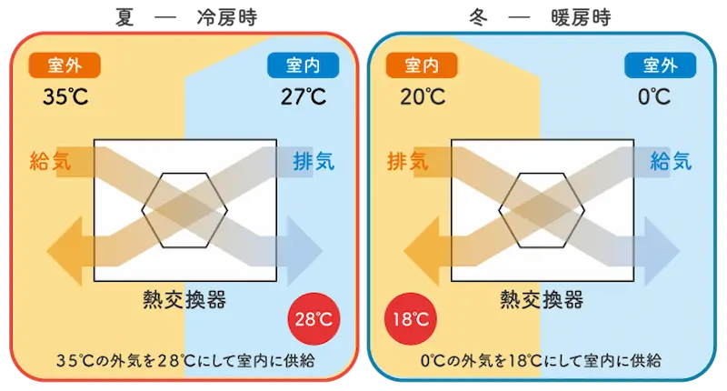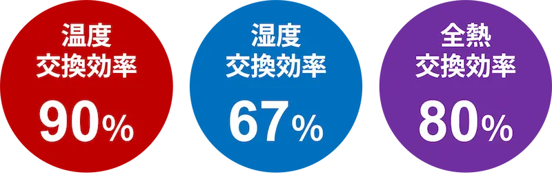換気によって失われる熱(温度)の90%を回収し、さらに湿度の67%を回収することによって、室内空間を快適にするとともに、冷暖房に必要なエネルギーを削減いたします。