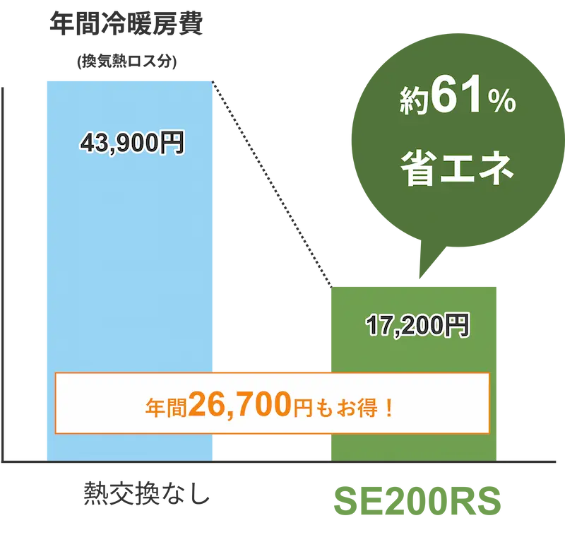 換気をしても暖房の熱や冷房の冷気を逃がさないため、年間を通して冷暖房費を節約することができます。熱交換機能のない換気装置SE200RSで年間の冷暖房費にかかるエネルギー消費量を比較すると、首都圏(埼玉県)の気温条件で約61%、金額にすると26,700円も節約になります。