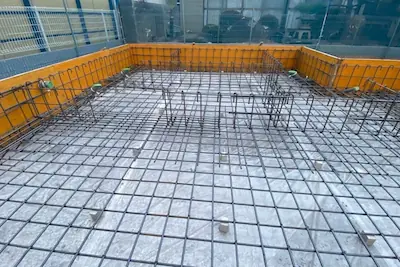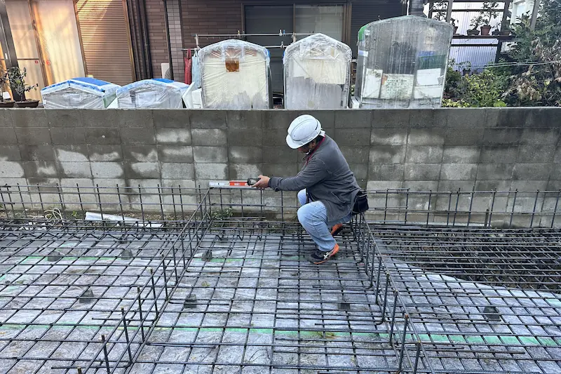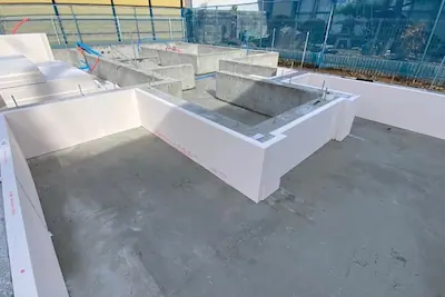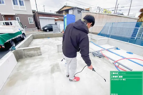 基礎のかぶり厚と配管ルールを統一し、耐久性を確保。コンクリート中性化対策にクリスタルシーラーを採用します。長寿命化へ、足元から強さを仕込みます。