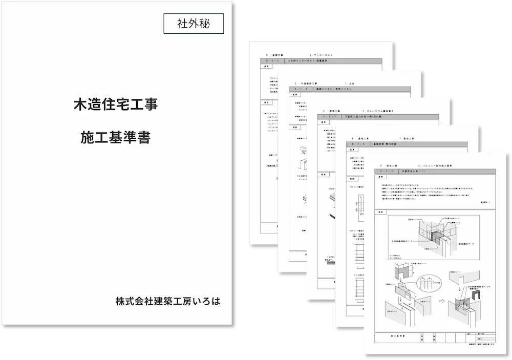 家づくりは、職人の経験や勘に頼るだけでは、どうしても品質に差が出てしまいます。そこで建築工房いろはでは、すべての工事工程を細かく定めた独自の「施工基準書」を整備。