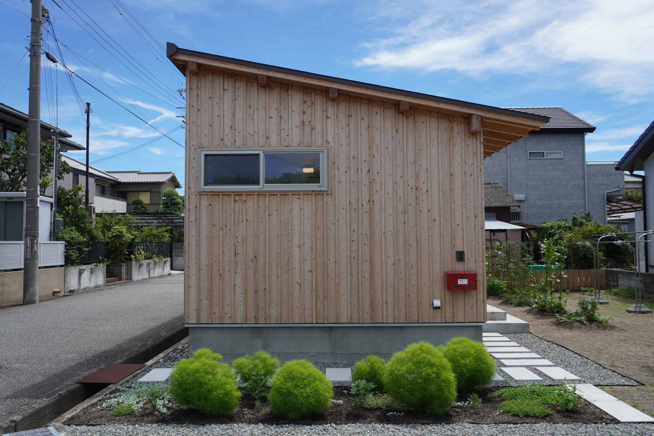道路側からは、片流れ屋根でキリッと引き締まった雰囲気。