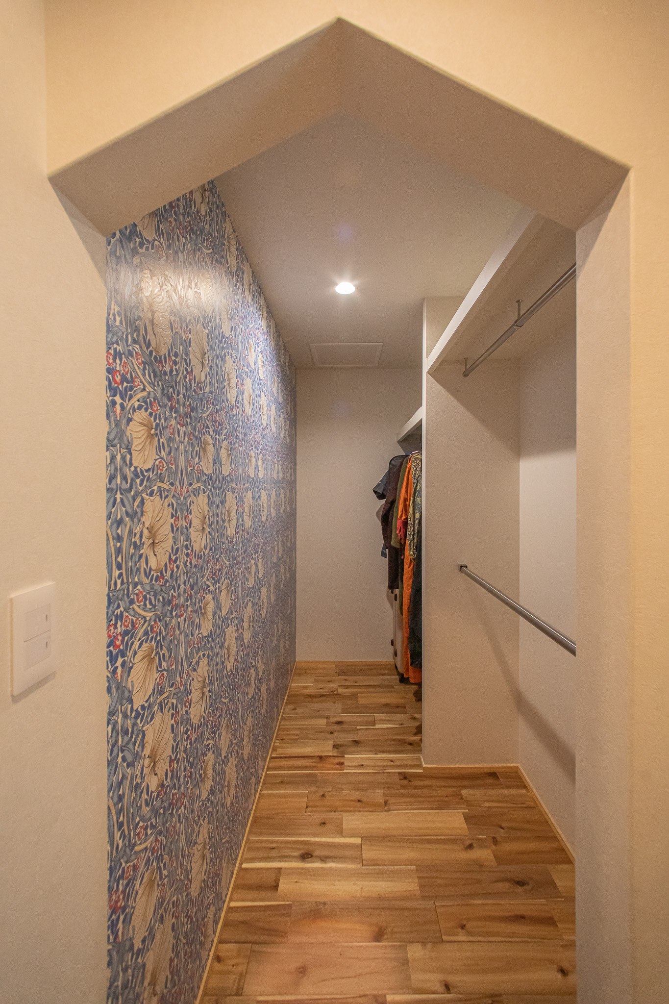 ウォークインクローゼットには、ウィリアムモリスの「ピンパーネル」を大胆に使用し、