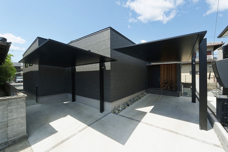 また、2カ所に設えたオールブラックのカーポートによって
